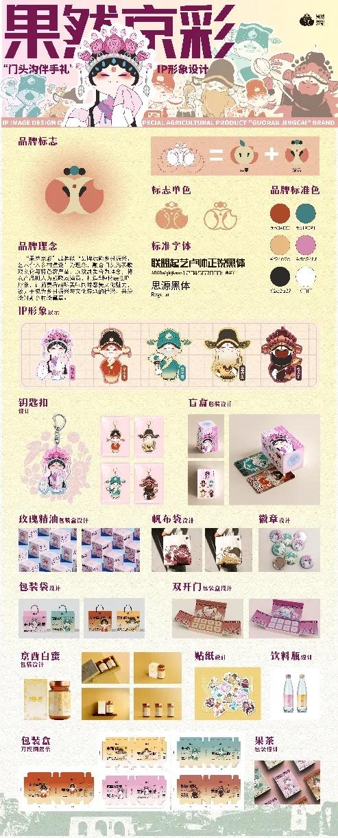 门头沟区有着优质的农产品与优秀的传统文化。我们小组对这二者进行结合,以品牌设计赋能乡村振兴、艺术介入乡村建设作为设计理念,将门头沟区的独特非物质文化遗产燕歌戏融入设计中,以生旦净末丑为形象原型,为妙峰山玫瑰、太子墓苹果、京白梨、京西白蜜、妙峰山樱桃这五种农产品,打造了果然京彩这一农产品品牌,设计了五个独特的IP形象。