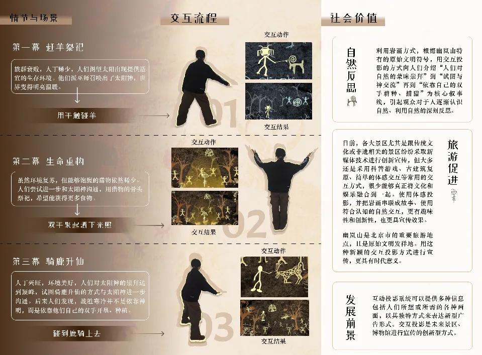 形成岩画互动影像。影像作品共三个场景:“赶羊祭祀重构生命骑鹿升仙。故事从人们对自然的蒙昧认识开始,对自然神明充满崇拜,直到自力更生用自己的双手创造美好生活,改造自然。通过体感交互,让热爱探险的登山者在岩画世界中,了解我们是如何一步步与自然产生联系,如何经历从认识自然,崇拜自然到改造自然的过程。穿越幽岚秘境,解码岩画传奇,和原始人一起揭开自然演进的神秘面纱!