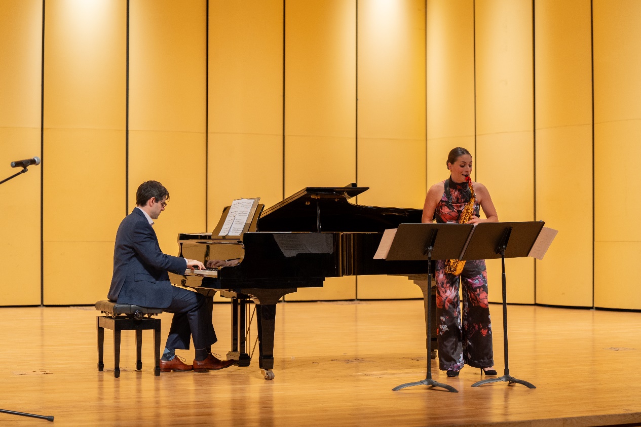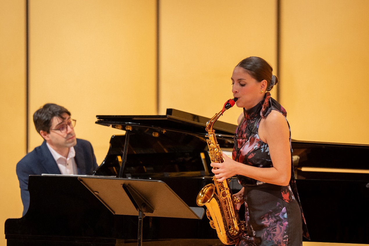 萨克斯演奏家克里奥·塞奥多里迪斯(Clio Theodoridis)和钢琴演奏家乔纳森·内姆塔努(Jonathan Nemtanu)为观众带来了一场精彩的室内乐演出。克利奥·塞奥多里迪斯作为斯德哥尔摩国际音乐比赛的铜牌得主,雅典 X.O.N 国家青年大赛的桂冠得主,以及第17届世界萨克斯大会的杰出获奖者,现场她向观众大胆展示了萨克斯无限变幻的可能性,令现场观众赞叹不已。乔纳森·内姆塔努作为加拿大魁北克萨格内音乐学院教授,曾师从多名著名音乐大师,并在多个国际比赛中获得殊荣,他的琴声美妙,又与萨克斯完美配合,精彩演绎了《美丽的夜晚》《回归巴赫》《红色赭石》等经典曲目。