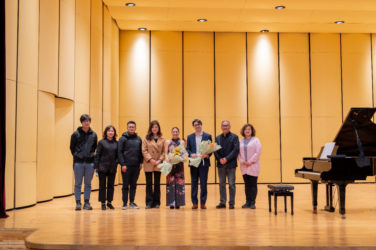 演出结束后,美育中心主任兼新媒体艺术与设计学院院长沈旭昆、美育中心副主任宋泽惠等与演奏家合影留念。